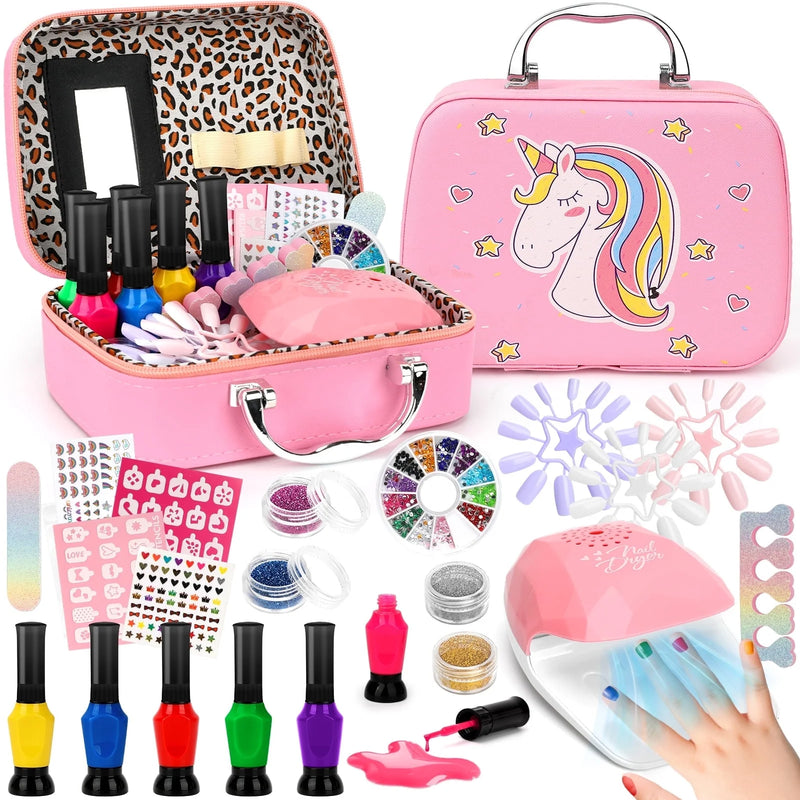 DIY NAIL KIT FOR GIRLS:The variety of DIY gadgets in our kids nail polish set allows kids to explore creativity while having fun, each unique design reflecting the kids personality and encouraging them to express their own style and ideas. The cute pattern and unicorn-shaped box can easily accommodate all nail polish sets and is easy to carry, so that children can share the joy with friends on many occasions and experience the fun of nail art together